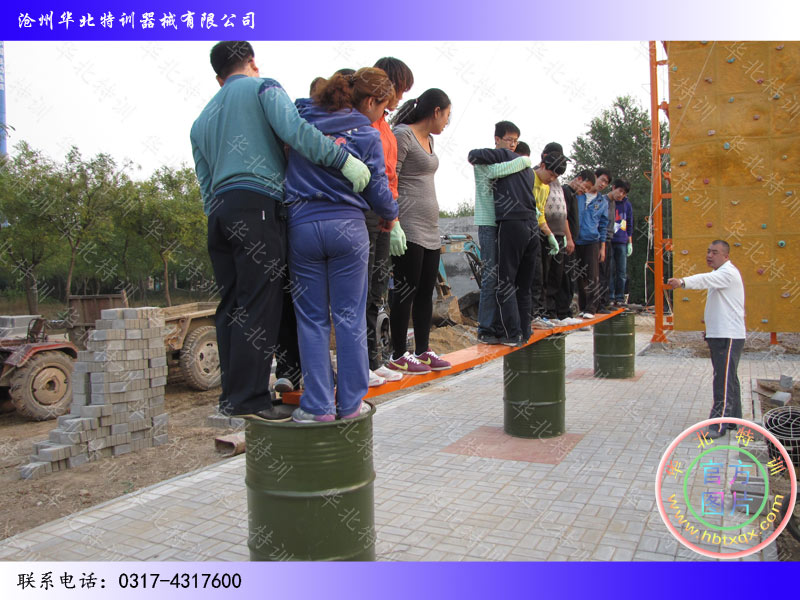 高空拓展器械:四面体。 地面拓展器材:背摔、地面相互依存、交通阻塞、模拟沼泽等。 |