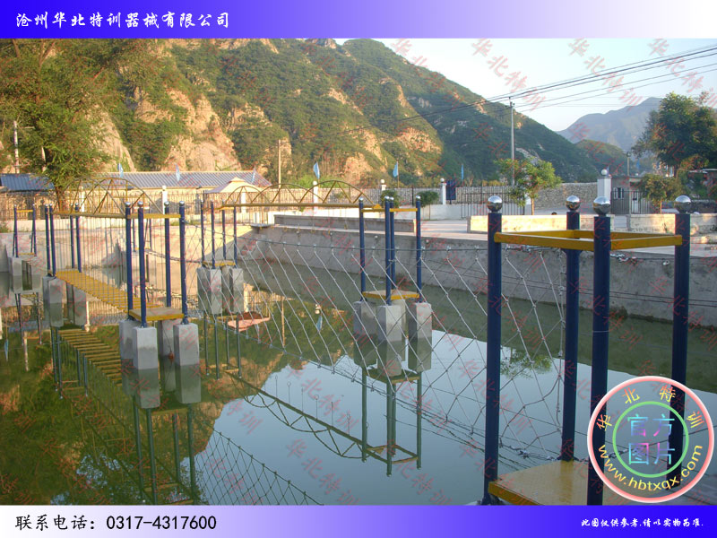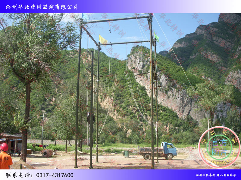 高空拓展器械:高空四面体。 地面拓展器材:模拟电网、地面相互依存等。 水上拓展设施:网绳桥、秋千桥、冰桥、缅甸桥、手吊环桥、吊索桥、钢丝桥等。 |