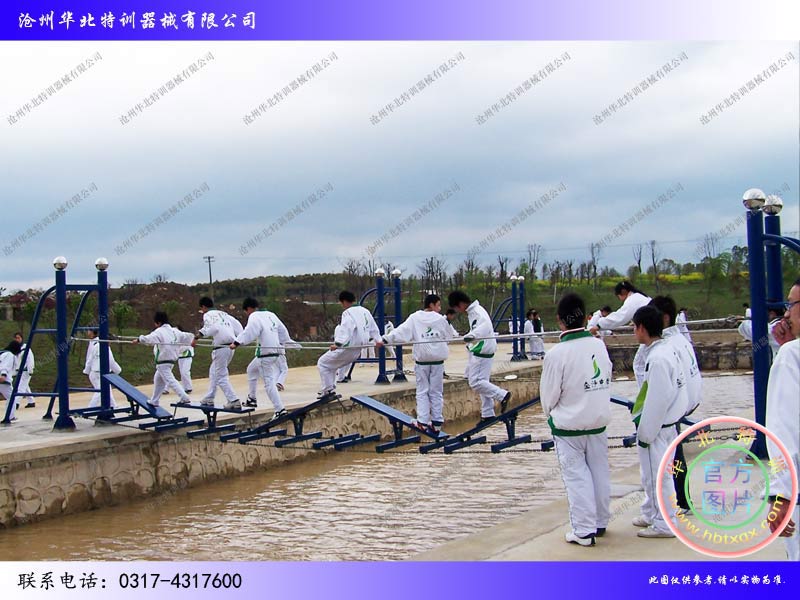 抓紧身体两侧的钢丝绳,脚踩桥板,掌握好平衡的同时慢慢向前移动,到达终点。 |